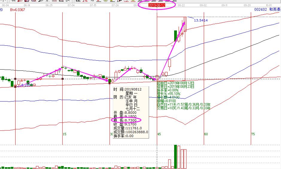 和而泰,贏家江恩于7號提前選出在自選,并提前預測分析未來時間窗在9號、12號,江恩認為時間是決定市場走勢最重要的因素,因此,9號、12號就是也給重要的變盤點,如果想要交易,就要重點關注這個時間節(jié)點。再看價格,7號給出關注點位8.8-9.10,在9號、12號,個股回落趨勢線支撐8.73,基本上與給出的關注點位8.8高度一致,時間和價格形成共振,合力促使轉勢行情。開啟一波牛市上漲行情,從時間窗12號至23號收盤,10個交易日,漲幅55%,這就是江恩的神奇。