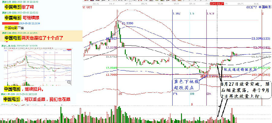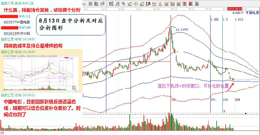 中國電影第一次分析的時間是在8月13日,由于是被套的股票,根據(jù)工具結(jié)果得出此位置超跌買點。從下圖中可以看到,當(dāng)時股價是處于極反通道藍色下軌線附近,這是超跌類買點的必要條件,同時,通過時間分析,發(fā)現(xiàn)股價處于黃金時間周期線0.618分割位,因此預(yù)判此位置可能會發(fā)生趨勢的轉(zhuǎn)折,即時間窗口+價格支撐=股價反轉(zhuǎn)向上。