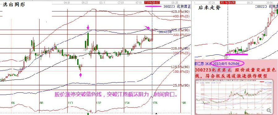 下圖是北京君正之前的一個激進(jìn)買點,現(xiàn)在做個回顧。8月2日是江恩時間窗口,當(dāng)天股價放量漲停突破藍(lán)色線,江恩循環(huán)阻力點,構(gòu)成了激進(jìn)買點,隨后市場震蕩不破藍(lán)色線,維持藍(lán)色線與紅色線區(qū)間內(nèi)的趨勢上攻走勢。