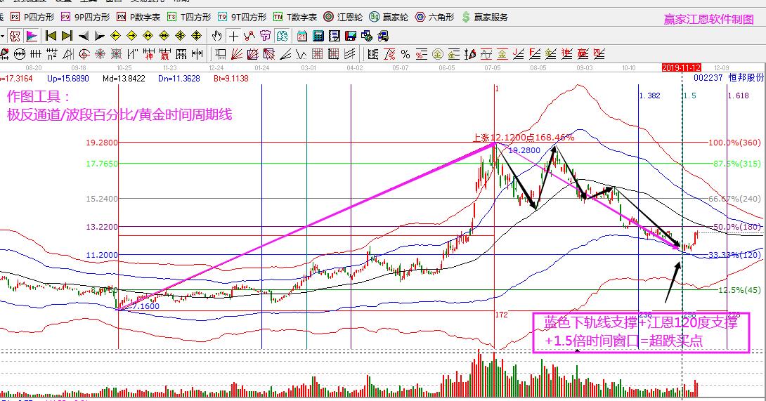 下圖是恒邦股份的超跌買點展示:股價調(diào)整到極反通道藍(lán)色下軌線,同時,江恩120度分割位支撐附近,疊加1.5倍時間窗口,短期共振向上,符合極反通道藍(lán)色下軌線超跌買點要求。短期從藍(lán)色下軌線反彈超10%,時間窗口11月12日為階段低點。按照規(guī)則買入,反彈目標(biāo)就是生命線。