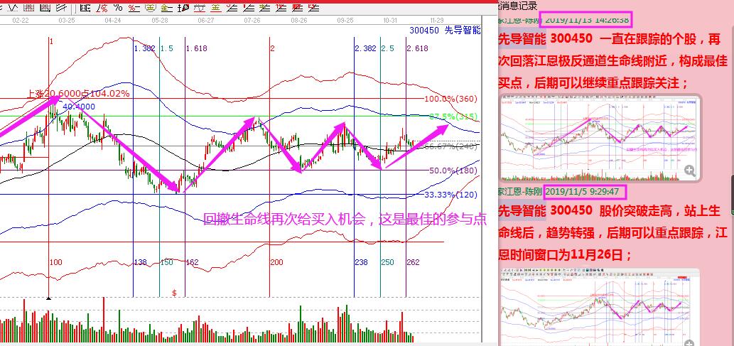 下圖是先導(dǎo)智能生命線的穩(wěn)健買點展示,10月28日股價放量突破生命線,隨后震蕩跌破,股價一直縮量生命線附近運(yùn)行,11月5日是站穩(wěn)生命線的第三個交易日,首次開始關(guān)注,11月13日股價在經(jīng)過拉升之后回撤至江恩240度支撐點,與生命線支撐點很近,價格上形成共振走勢,同時股價處于明確的上漲周期中,故,趨勢,價格,時間符合極反通道穩(wěn)健買點要求,按照規(guī)則買入,持股目標(biāo)就是藍(lán)色線。