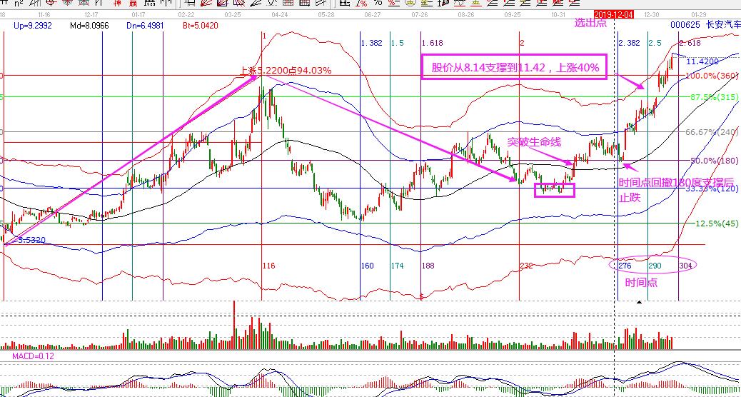 長安汽車,是在2019年12月4日選出,理由是:股價(jià)處于生命線上強(qiáng)勢區(qū)域,價(jià)格在江恩180度重要支撐附近,12月6日為時(shí)間窗口。同時(shí),市場整體處于非下跌周期中。股價(jià)在時(shí)間窗口回撤江恩180度及生命線支撐,構(gòu)成了最佳買點(diǎn),12月11日股價(jià)突破240度阻力,向上打開新的空間,市場沿著藍(lán)色線向上運(yùn)行,目前已經(jīng)運(yùn)行到紅色線附近,從選出到今天,按照規(guī)則操作持股,這波的盈利空間超過40%。
