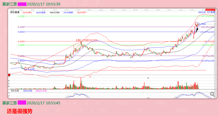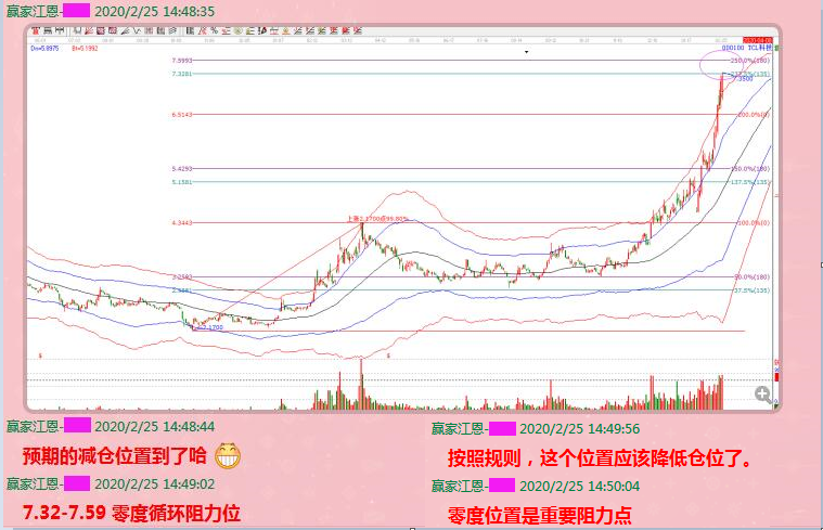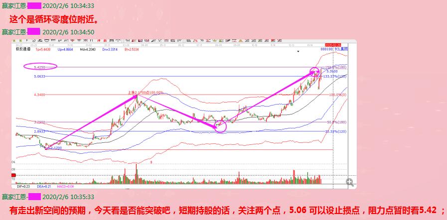 下圖是TCL科技在2月6日的技術(shù)分析圖形,具體的作圖方法是,以2018年10月19日的低點(diǎn)和2019年3月25日的高點(diǎn)為起始點(diǎn),作出江恩波段百分比延伸線(江恩經(jīng)典價(jià)格循環(huán)分析工具之一),保留120度和180度分割(后期調(diào)整為135度和180度,更契合市場(chǎng)的歷史走勢(shì))。從圖中可以看到,股價(jià)在從最低點(diǎn)2.17起漲后,紅色線見頂回落,并最終在江恩波段百分比120度與180度空間完成止跌,這個(gè)分割位是我們?cè)趯?shí)戰(zhàn)運(yùn)用中頻繁強(qiáng)調(diào)的調(diào)整位。止跌之后震蕩上行,并在2019年12月17日突破站上了100%的零度位,此為前期高點(diǎn),股價(jià)在突破后,進(jìn)入到了新的空間,即100%到133.3%-150%分割區(qū)間,價(jià)格波動(dòng)空間為4.34-5.42。2月6日股價(jià)放量上攻,突破了5.06直接挑戰(zhàn)5.42,此時(shí)我們要關(guān)注的是,該循環(huán)空間是否會(huì)打開,股價(jià)進(jìn)入新的空間。其關(guān)鍵點(diǎn)就是,價(jià)格突破5.42。此位置對(duì)應(yīng)了33.33%-50%區(qū)間。當(dāng)天最終股價(jià)放量漲停突破。