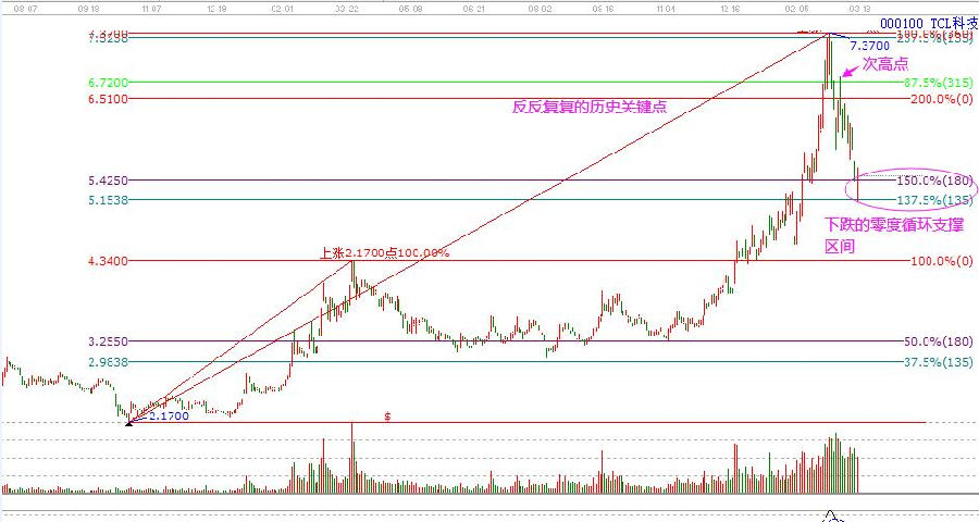 股價(jià)的波動(dòng)很快,但是如何去應(yīng)對(duì)市場(chǎng)的漲跌,漲了是否有賣出的位置,跌了是否有買入的位置,成功的投資者都是逆向的,在普通散戶追入的時(shí)候,他們賣出,而在普通散戶割肉的時(shí)候,他們進(jìn)場(chǎng)。TCL科技幾乎可以賣在最高的區(qū)間,而隨后股價(jià)反彈形成的次級(jí)別高點(diǎn)一樣是可以借助江恩工具來判斷出來的,這是股價(jià)向下波動(dòng),反抽的關(guān)鍵次高點(diǎn)形成位,是江恩波段315度分割點(diǎn)。可以看到,隨后股價(jià)便跌破6.51關(guān)鍵點(diǎn),下尋到新的循環(huán)點(diǎn)。