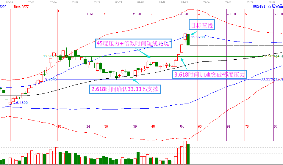我們再結合雙塔食品江恩式分析圖形,回顧贏家江恩的精準分析。圖中工具:極反通道+江恩價格百分比+黃金時間周期線: