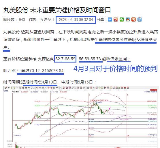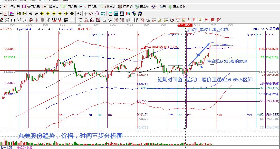 4月3日選出時股價處于生命線阻力下方,當時給出的參考點有三個,兩個低吸區(qū)間,一個穩(wěn)健點(突破生命線后)。股價隨后回撤至第一支撐區(qū)間62.7-65.59,其中價格最低點為4月9日的63.27,為選出后的最低點,4月10日維持反彈,開始這波拉升,股價在生命線及315度遇阻之后順利突破上行,到目前股價也已創(chuàng)出歷史新高。最新技術圖形如下,可對比選出進行學習。