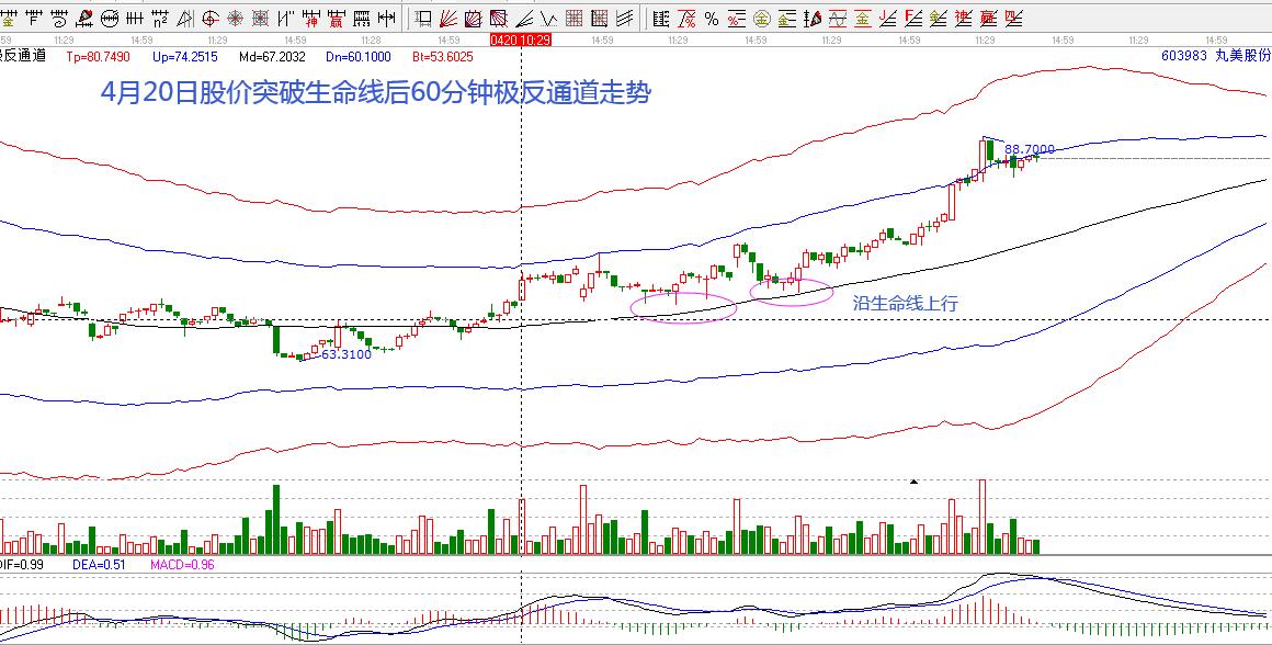 股價的上漲階段,筆者調(diào)整了價格分析圖,將波段百分比調(diào)整為波段百分比延伸線,同時,在震蕩階段所需關注的60分鐘級別極反通道走勢給大家做個展示,我們知道趨勢行情下60分鐘生命線是做趨勢跟蹤的關鍵位,因為強勢上漲階段股價不會跌破此位置,甚至跌破之后也可以快速收回。