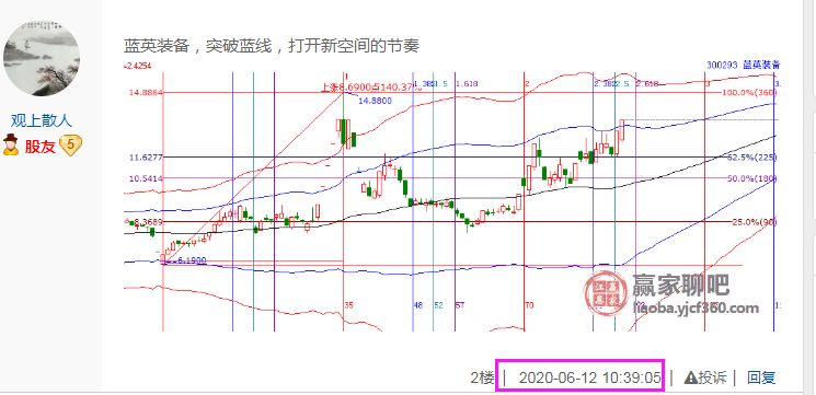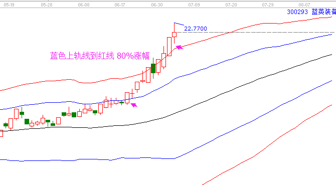 1、蘭英裝備6月12日突破藍色上軌線,目前創(chuàng)下新高,短短14個交易圖80%漲幅