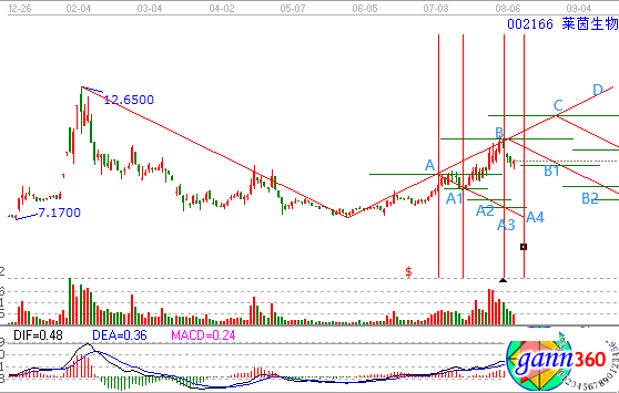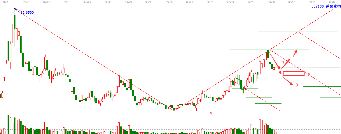 由于我們分析研究的周期時間跨度有近一年,因此在結(jié)果上可能會有幾天的小誤差,想要更加精確,只需要研究小周期就可以了。我們通過上面的研究分析得到,股票會沿著紅色斜線標注的趨勢方向運行,會在趨勢轉(zhuǎn)折點位發(fā)生走勢的變化,同時會在綠線的位置獲得支撐或者壓力,那么接下來我們就通過這個工具來對002166萊茵生物未來的走勢進行分析預(yù)測。