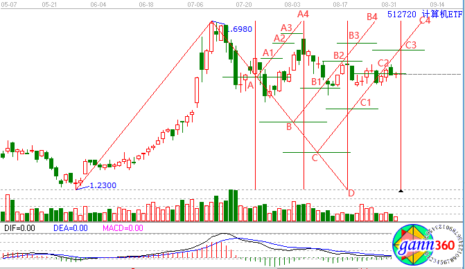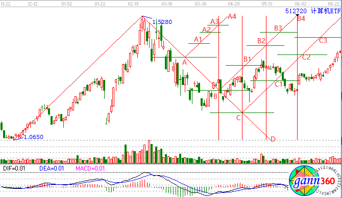 圖中A點(diǎn)所對應(yīng)的時間窗口是短期一波上漲的結(jié)束,之后便是下跌,A4點(diǎn)和D點(diǎn)所對應(yīng)的時間窗口同樣也是上漲的結(jié)束,之后出現(xiàn)下跌。那么計(jì)算機(jī)ETF接下來怎么走呢?