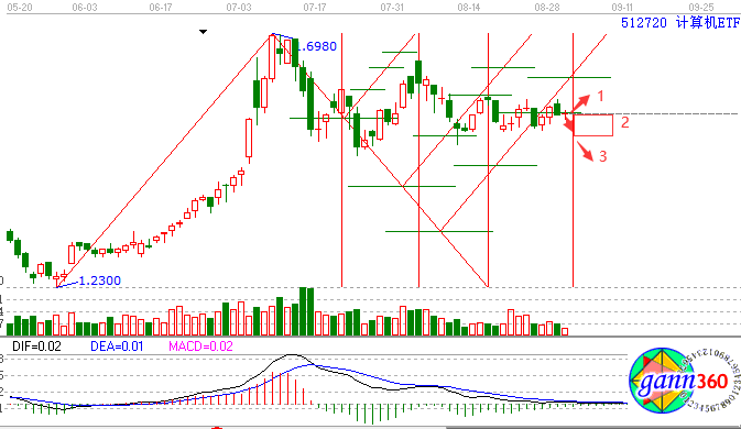 今天我們就借助贏家江恩軟件中的轉(zhuǎn)折趨勢線來對于計(jì)算機(jī)板塊來進(jìn)行分析,相應(yīng)的我們就需要在計(jì)算機(jī)ETF的K圖中進(jìn)行作圖分析。(圖中的紅色斜線為趨勢線,綠色橫線為支撐、壓力線,紅色豎線是為了方便展示轉(zhuǎn)折點(diǎn)所對應(yīng)的K線位置)