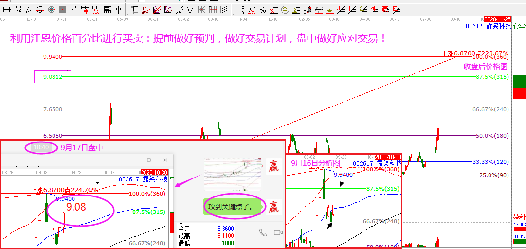 技術(shù)分析研究的是市場(chǎng)行為規(guī)律,分析的核心是量?jī)r(jià)時(shí)空4個(gè)基本要素,其中時(shí)間是最關(guān)鍵因素。時(shí)間分析可以確定市場(chǎng)所處的階段是漲還是跌,以及未來(lái)的價(jià)格運(yùn)行結(jié)構(gòu)。因此,在股價(jià)進(jìn)入調(diào)整周期之后,下跌就是主旋律。而在這個(gè)過(guò)程中,結(jié)合價(jià)格工具尋找賣(mài)點(diǎn)則是唯一選擇。在高點(diǎn)確立以后,賣(mài)出的位置可以通過(guò)江恩工具進(jìn)行預(yù)判,常見(jiàn)的次級(jí)別高點(diǎn)通常會(huì)出現(xiàn)在價(jià)格的315度,極反通道的紅色線(xiàn)或者藍(lán)色線(xiàn)附近。圖中的雙星新材,股價(jià)在紅色線(xiàn)見(jiàn)高點(diǎn)后,按照規(guī)則,跌破藍(lán)色線(xiàn)反抽不上,則要回落生命線(xiàn)。其價(jià)格315度為價(jià)格分析的關(guān)鍵點(diǎn),此位置如果跌破,反抽不上很容易形成次高點(diǎn)。對(duì)于這樣的位置,操作上對(duì)應(yīng)的依舊是賣(mài)出。同時(shí),預(yù)期調(diào)整的低點(diǎn)則是生命線(xiàn)和240度附近。按照阻力賣(mài)出,支撐買(mǎi)入的規(guī)則進(jìn)行操作,極反通道結(jié)合價(jià)格工具完美把握次高點(diǎn)逃頂。