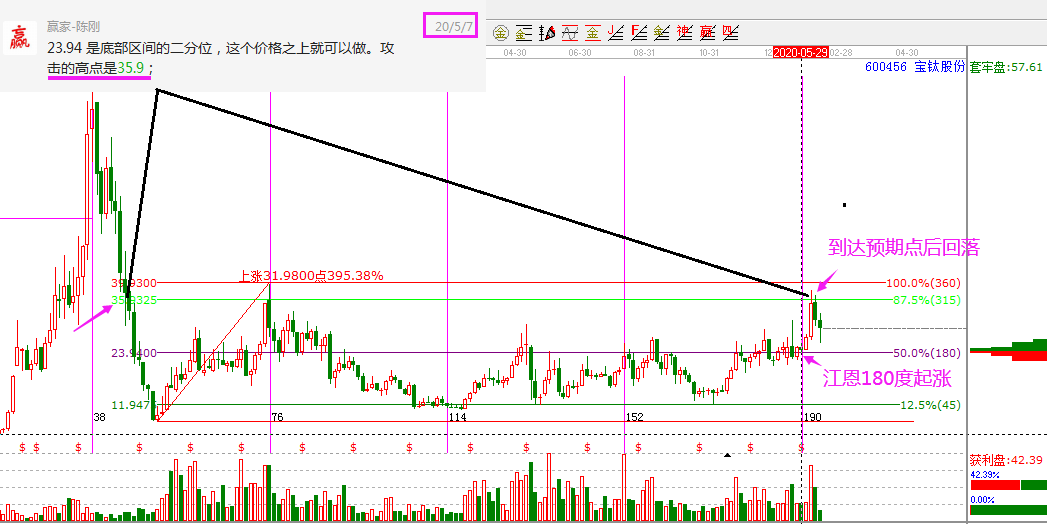 股票操作到最后其實(shí)就是買(mǎi)和賣(mài)的問(wèn)題,因此買(mǎi)賣(mài)點(diǎn)的確定,甚至比選股更重要,因?yàn)槿魏喂善?,有波?dòng)就有套利空間。但是,對(duì)于價(jià)格的分析,大部分投資者依舊停留在看均線(xiàn)指標(biāo)這種簡(jiǎn)單的跟隨上,依據(jù)這個(gè)想要判斷出好的買(mǎi)點(diǎn)和賣(mài)點(diǎn)難度太大。江恩理論是一套技術(shù)分析體系,其核心之一就是價(jià)格空間分析,借助江恩工具可以快速的判斷出市場(chǎng)的波動(dòng)空間以及當(dāng)下的支撐阻力點(diǎn),而在確定了支撐-買(mǎi)點(diǎn)的位置,也同時(shí)確定了阻力的賣(mài)出位置,以及不及預(yù)期的止損點(diǎn)。這就是提前對(duì)市場(chǎng)價(jià)格走勢(shì)作出預(yù)判的過(guò)程。寶鈦股份5月初的分析,按照江恩操作規(guī)則,一線(xiàn)站穩(wěn)看高一線(xiàn),股價(jià)在時(shí)間窗口突破站上180度23.94之后,價(jià)格目標(biāo)點(diǎn)看高一線(xiàn)到315度35.9。