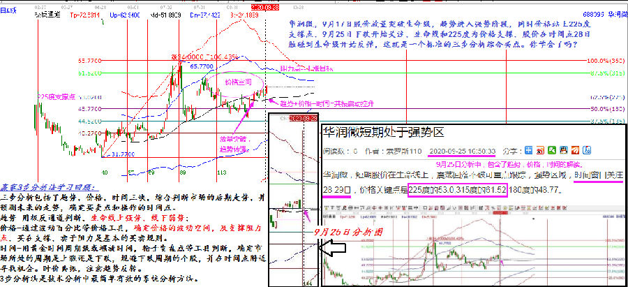 華潤(rùn)微,9月17日股價(jià)放量突破生命線,趨勢(shì)進(jìn)入強(qiáng)勢(shì)階段,同時(shí)價(jià)格站上225度支撐點(diǎn),9月25日下跌開始關(guān)注,生命線和225度為價(jià)格支撐.