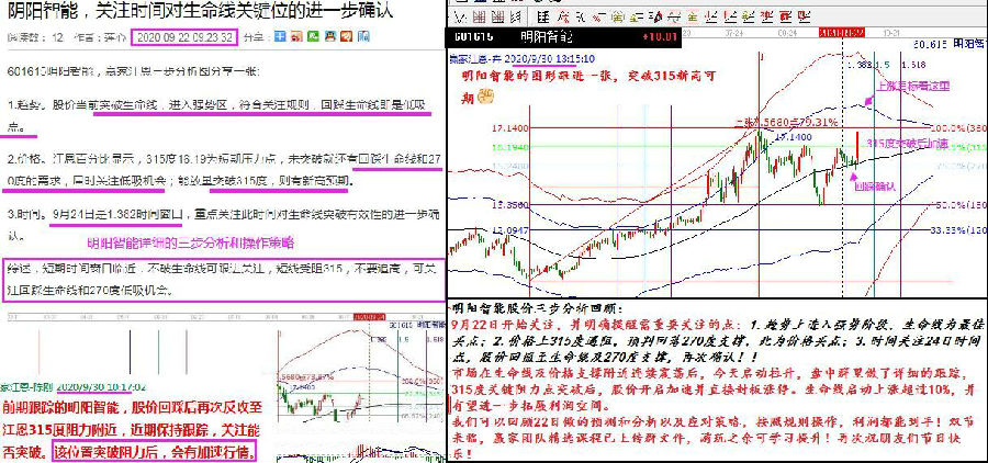 9月22日開始關(guān)注,并明確提醒需重要關(guān)注的點(diǎn):1.趨勢(shì)上進(jìn)入強(qiáng)勢(shì)階段,生命線為最佳買點(diǎn);2.價(jià)格上315度遇阻,預(yù)判回落270度支撐,此為價(jià)格買點(diǎn);3.時(shí)間關(guān)注24日時(shí)間點(diǎn),股價(jià)回撤至生命線及270度支撐,再次確認(rèn)!