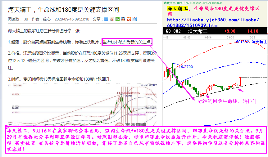 海天精工,9月16日在贏家聊吧分享圖形,強(qiáng)調(diào)生命線和180度是關(guān)鍵支撐區(qū)間,回踩生命線是新的關(guān)注點(diǎn)。9月29日早盤再次分享到群里供驗(yàn)證學(xué)習(xí)對(duì)照?qǐng)D形去看,標(biāo)準(zhǔn)回踩生命線后展開拉升,今天收獲漲停板!選股模型-買賣位置-交易信號(hào),掌握了都是自己從市場(chǎng)抓錢的本事!