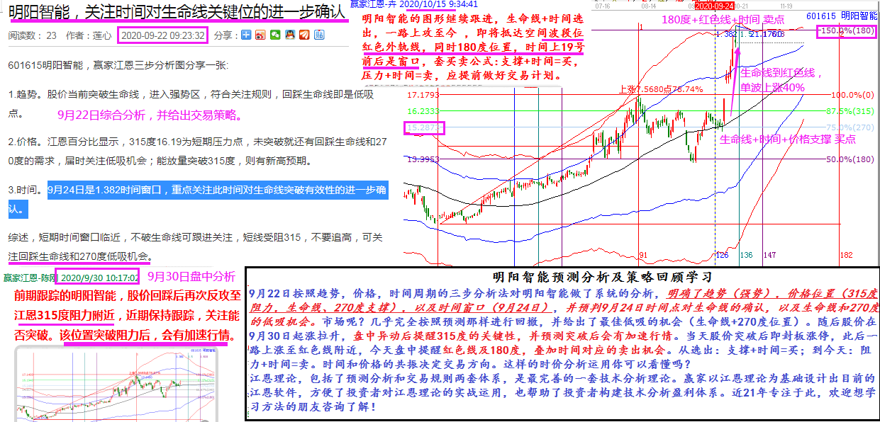 9月22日按照趨勢(shì),價(jià)格,時(shí)間周期的三步分析法對(duì)明陽智能做了系統(tǒng)的分析,明確了趨勢(shì)(強(qiáng)勢(shì)),價(jià)格位置(315度阻力,生命線、270度支撐),以及時(shí)間窗口(9月24日),并預(yù)判9月24日時(shí)間點(diǎn)對(duì)生命線的確認(rèn),以及生命線和270度的低吸機(jī)會(huì)。市場(chǎng)呢?幾乎完全按照預(yù)測(cè)那樣進(jìn)行回撤,并給出了最佳低吸的機(jī)會(huì)(生命線+270度位置)。隨后股價(jià)在9月30日起漲拉升,盤中異動(dòng)后提醒315度的關(guān)鍵性,并預(yù)測(cè)突破后會(huì)有加速行情。當(dāng)天股價(jià)突破后即封板漲停,此后一路上漲至紅色線附近,今天盤中提醒紅色線及180度,疊加時(shí)間對(duì)應(yīng)的賣出機(jī)會(huì)。從選出:支撐+時(shí)間=買;到今天:阻力+時(shí)間=賣。時(shí)間和價(jià)格的共振決定交易方向。這樣的時(shí)價(jià)分析運(yùn)用你可以看懂嗎?