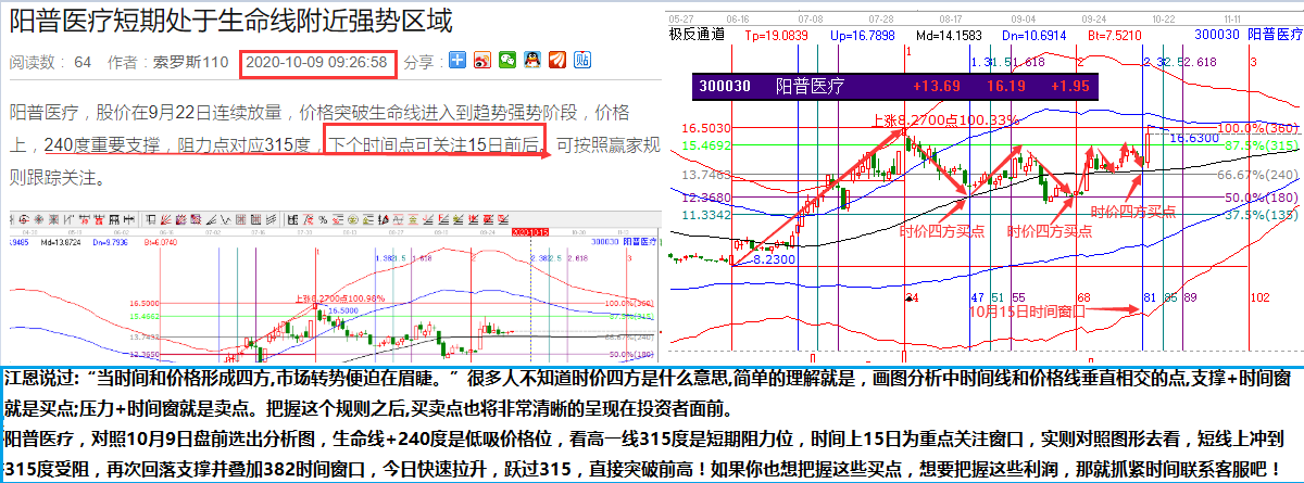 陽普醫(yī)療,對(duì)照10月9日盤前選出分析圖,生命線+240度是低吸價(jià)格位,看高一線315度是短期阻力位,時(shí)間上15日為重點(diǎn)關(guān)注窗口,實(shí)則對(duì)照?qǐng)D形去看,短線上沖到315度受阻,再次回落支撐并疊加382時(shí)間窗口,今日快速拉升,躍過315,直接突破前高!