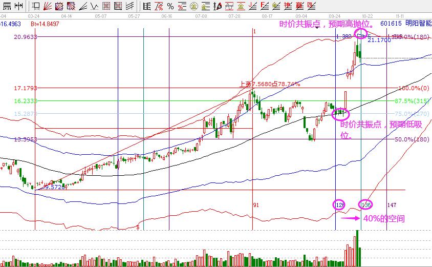 按照江恩百分比買(mǎi)賣(mài)法則,315度分割一旦突破,股價(jià)將創(chuàng)新高。10月9日直接高開(kāi)突破前高到藍(lán)色線附近,10月13日突破藍(lán)色線,10月15日抵達(dá)紅色線以及波段百分比延伸線150%分割的20.96。短期時(shí)間窗口臨近,這波上攻進(jìn)入到高拋區(qū)。生命線到紅色線的一波上漲行情就這么走了出來(lái),股價(jià)單波上漲接近40%的空間。