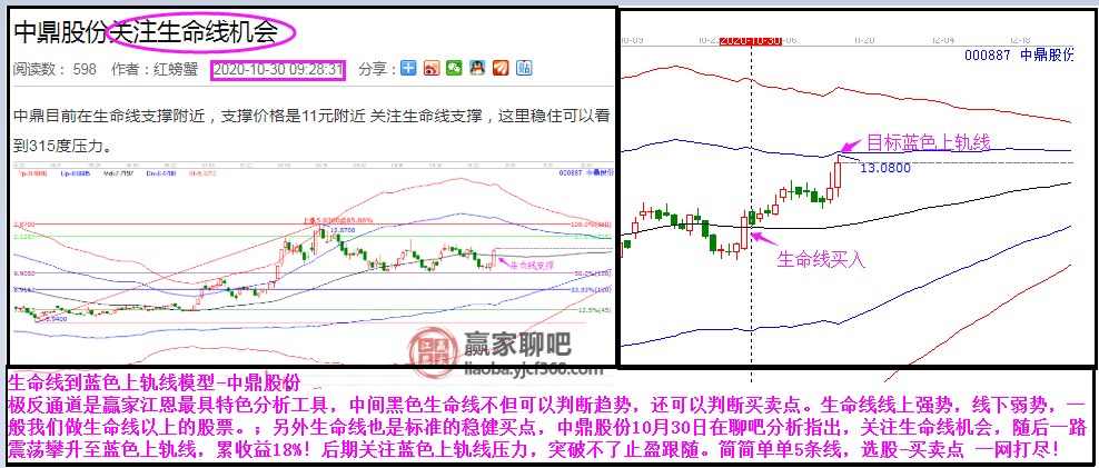 極反通道是贏家江恩最具特色分析工具,中間黑色生命線不但可以判斷趨勢,還可以判斷買賣點。生命線線上強勢,線下弱勢,一般我們做生命線以上的股票。;另外生命線也是標準的穩(wěn)健買點,中鼎股份10月30日在聊吧分析指出,關注生命線機會,隨后一路震蕩攀升至藍色上軌線,累收益18%!后期關注藍色上軌線壓力,突破不了止盈跟隨。簡簡單單5條線,選股-買賣點 一網(wǎng)打盡!
