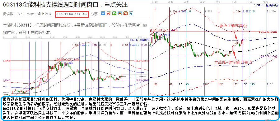 603113金能科技11月4日早盤被選出,股票站上生命線并且到達時間窗口,當天進行了一波大幅拉升,隨后一路上攻到藍色上軌線,這一段10%,如果你是穩(wěn)健型選手,這里就可以出局去尋找下一個這樣的股票,重復同樣的操作。而一旦股票在藍色上軌線站穩(wěn)就有繼續(xù)上攻紅色外軌線的需求。