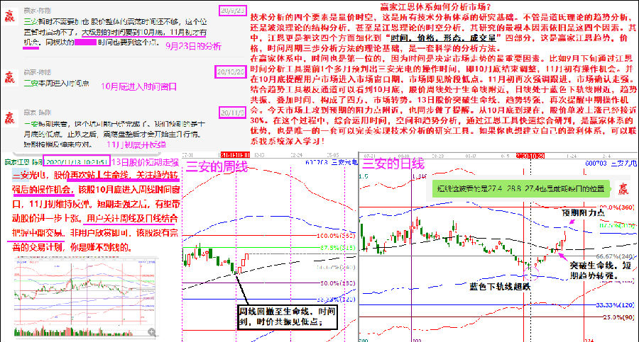 在贏家體系中,時間也是第一位的,因為時間是決定市場走勢的最重要因素。比如9月下旬通過江恩時間分析工具提前1個多月預判出三安光電的操作時間,即10月底結束調(diào)整,11月初有操作機會。并在10月底提醒用戶市場進入市場窗口期,市場即見階段低點。11月初再次強調(diào)跟進,市場確認走強。結合趨勢工具極反通道可以看到10月底,股價周線處于生命線附近,日線處于藍色下軌線附近,趨勢共振,疊加時間,構成了四方,市場轉勢。13日股價突破生命線,趨勢轉強,再次提醒中期操作機會。今天市場上攻到預期的阻力點附近,也同步做了提醒。從10月底到現(xiàn)在,股價單波上漲已經(jīng)接近30%。在這個過程中,綜合運用時間,空間和趨勢分析,通過江恩工具快速綜合研判,是贏家體系的優(yōu)勢,也是唯一的一套可以完美實現(xiàn)技術分析的研究工具。