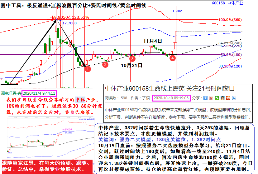 中體產(chǎn)業(yè),382時間踩著生命線快速拉升,3天25%的漲幅?;仡櫩偨Y記下技術要點,才能更懂模型,并做到利潤復制。10月19日盤前:按照強勢二買選股模型分享學習,給出21日窗口。實則,躍過時間站上180度后,如期看高一線至240度。11月4日結合小周期強調(diào)阻力。之后,再次回落生命線和180度支撐帶,同時迎來1.382關鍵時間拐點后,展開快速上攻,一舉突破240度,今日再次封板突破藍線。持倉的提高止盈看紅線,有預期更要有規(guī)則。