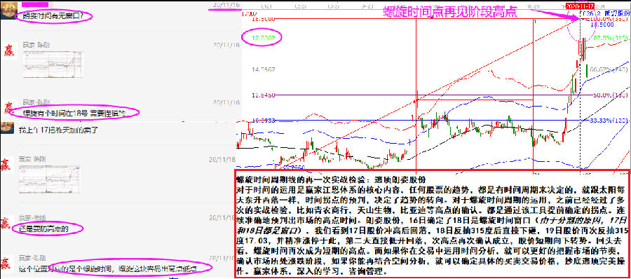 對于時(shí)間的運(yùn)用是贏家江恩體系的核心內(nèi)容,任何股票的趨勢,都是有時(shí)間周期來決定的,就跟太陽每天東升西落一樣, 時(shí)間拐點(diǎn)的預(yù)判,決定了趨勢的轉(zhuǎn)向。對于螺旋時(shí)間周期的運(yùn)用,之前已經(jīng)經(jīng)過了多次的實(shí)戰(zhàn)檢驗(yàn),比如青農(nóng)商行,天山生物,比亞迪等高點(diǎn)的確認(rèn)都是通過該工具提前確定的拐點(diǎn)。連續(xù)準(zhǔn)確地預(yù)判出市場的高點(diǎn)時(shí)間。朗姿股份,16日確定了18日是螺旋時(shí)間窗口( 由于分割的原因,17日和18日都是窗口),我們看到17日股價(jià)沖高后回落,18日反抽315度后直接下砸,19日股價(jià)再次反抽315度17.03,并精準(zhǔn)漲停于此,第二天直接低開回落,次高點(diǎn)再次確認(rèn)成立,股價(jià)短期向下轉(zhuǎn)勢?;仡^去看,螺旋時(shí)間再次成為短期的高點(diǎn)。而如果你在交易中運(yùn)用時(shí)間分析,就可以更好的把握市場的節(jié)奏,確認(rèn)市場所處漲跌階段;如果你能再結(jié)合空間分析,就可以確定具體的買賣交易價(jià)格,抄底逃頂完美操作。