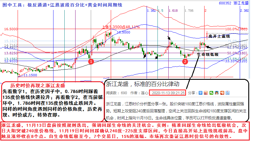 浙江龍盛,11月13日盤前按照規(guī)則選出,強(qiáng)調(diào)回踩生命線的關(guān)注機(jī)會。實(shí)則:精準(zhǔn)回踩生命線給出低吸機(jī)會,次日大陽突破240度價(jià)格線,11月19日時(shí)間回踩確認(rèn)240度-225度支撐區(qū)間,今日直接高開站上藍(lán)線挑戰(zhàn)前高,盤中觸及漲停收在8個(gè)點(diǎn)。自生命線低吸至今,7個(gè)交易日,15%的漲幅。市場再次鑒證江恩時(shí)價(jià)信號的有效性。