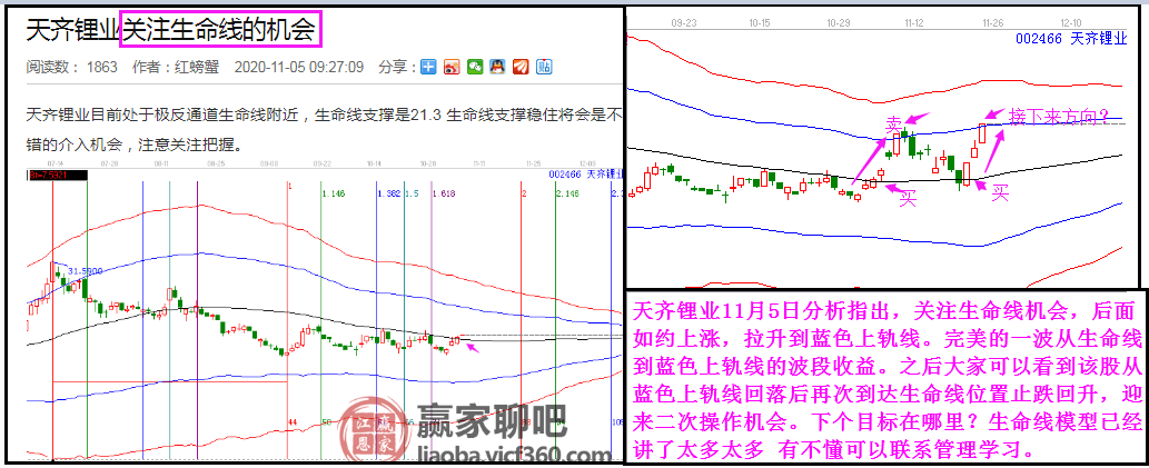 天齊鋰業(yè)11月5日分析指出,關(guān)注生命線機(jī)會,后面如約上漲,拉升到藍(lán)色上軌線。完美的一波從生命線到藍(lán)色上軌線的波段收益。之后大家可以看到該股從藍(lán)色上軌線回落后再次到達(dá)生命線位置止跌回升,迎來二次操作機(jī)會。下個(gè)目標(biāo)在哪里?生命線模型已經(jīng)講了太多太多 有不懂可以聯(lián)系管理學(xué)習(xí)。