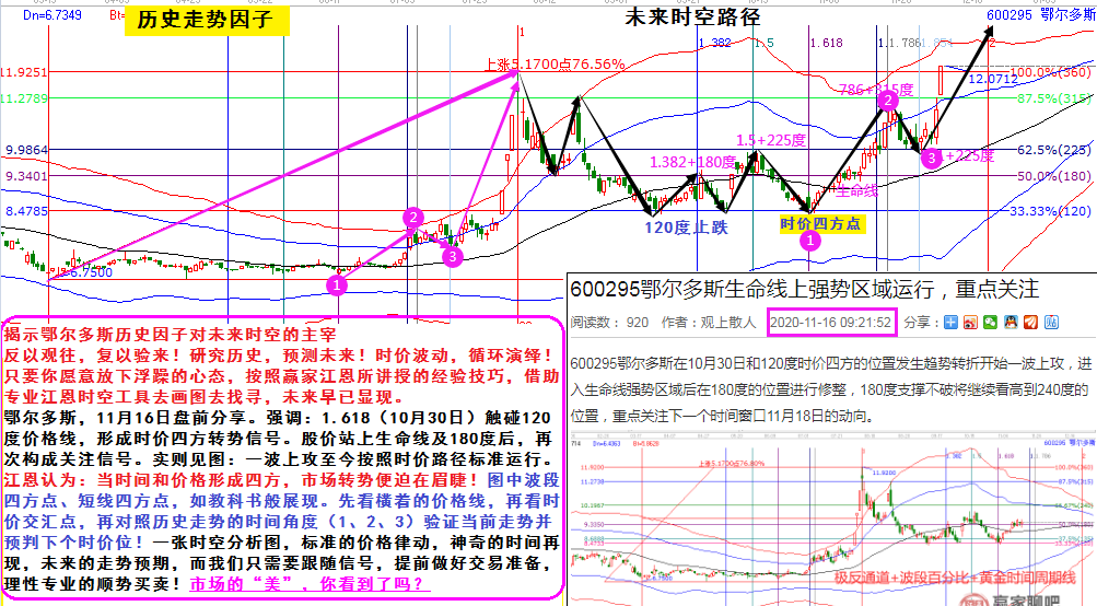 鄂爾多斯,11月16日盤前分享。強(qiáng)調(diào):1.618(10月30日)觸碰120度價(jià)格線,形成時(shí)價(jià)四方轉(zhuǎn)勢(shì)信號(hào)。股價(jià)站上生命線及180度后,再次構(gòu)成關(guān)注信號(hào)。實(shí)則見(jiàn)圖:一波上攻至今按照時(shí)價(jià)路徑標(biāo)準(zhǔn)運(yùn)行。