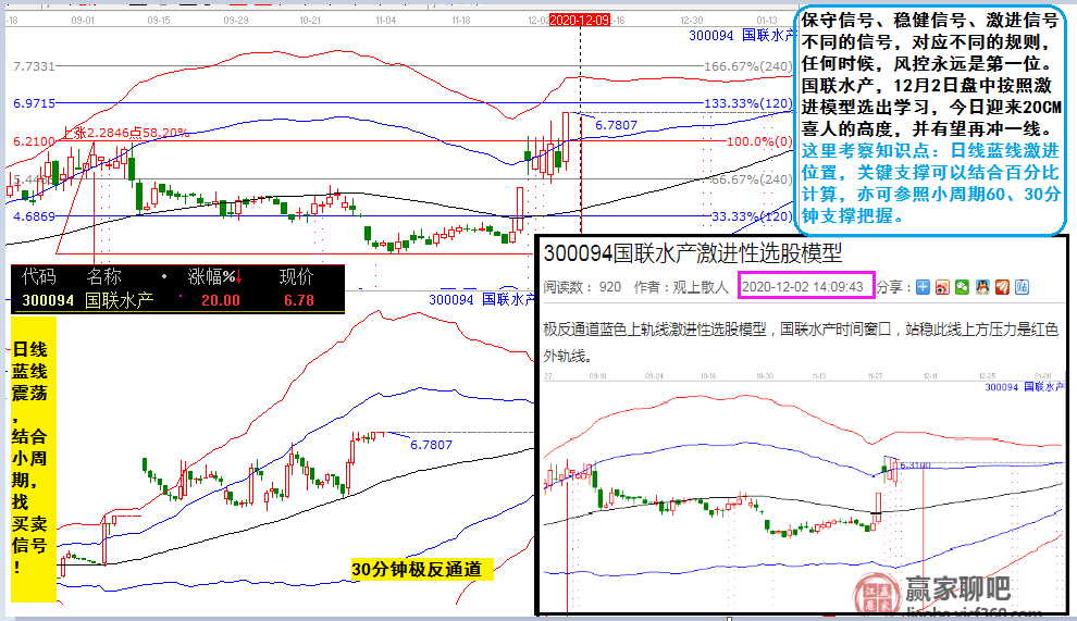 國(guó)聯(lián)水產(chǎn),12月2日盤中按照激進(jìn)模型選出學(xué)習(xí),今日迎來(lái)20CM喜人的高度,并有望再?zèng)_一線。這里考察知識(shí)點(diǎn):日線藍(lán)線激進(jìn)位置,關(guān)鍵支撐可以結(jié)合百分比計(jì)算,亦可參照小周期60、30分鐘支撐把握。保守信號(hào)、穩(wěn)健信號(hào)、激進(jìn)信號(hào)。不同的交易信號(hào),對(duì)應(yīng)不同的規(guī)則,任何時(shí)候,風(fēng)控永遠(yuǎn)是第一位。