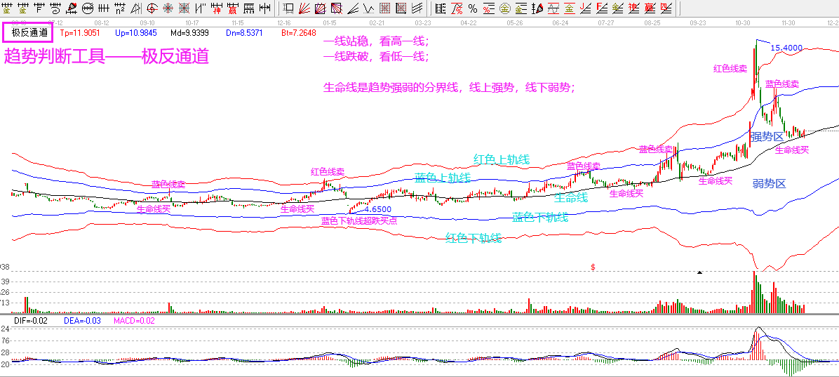 極反通道是在道家物極必反思想的基礎(chǔ)上,融合江恩的經(jīng)典分割理論,用5條線直觀清晰的展現(xiàn)市場(chǎng)當(dāng)下的趨勢(shì)以及價(jià)格的波動(dòng)空間。具體判斷方法如下:1.判斷趨勢(shì)——極反通道中間的黑色線,稱為生命線。依據(jù)股價(jià)與生命線的關(guān)系:股價(jià)在生命線以上,則股票強(qiáng)勢(shì)可以操作;股價(jià)在生命線以下,則股票弱勢(shì)暫不考慮。生命線是一個(gè)強(qiáng)勢(shì)股票的啟動(dòng)點(diǎn),所以贏家建議優(yōu)先考慮生命線附近的股票,有強(qiáng)勢(shì)股不做弱勢(shì)股。2漲跌空間預(yù)判——5條線互為支撐和壓力:一線站穩(wěn)看高一線,一線受阻(跌破)回調(diào)一線。記?。壕€上支撐,線下壓力。當(dāng)前股價(jià)在線上則為支撐,站穩(wěn)上漲目標(biāo)看高一線;當(dāng)前股價(jià)在線下則為壓力,上不去回調(diào)空間看低一線。3.買賣點(diǎn)確定——支撐站穩(wěn)即是買點(diǎn),壓力過(guò)不去則是賣點(diǎn)。