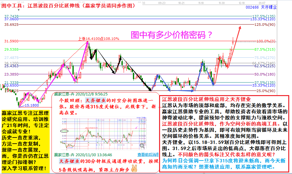 江恩認(rèn)為市場(chǎng)的頂部和底部,均存在完美的數(shù)學(xué)關(guān)系。贏家江恩借助專業(yè)的工具,幫助投資者有效看清市場(chǎng)的神奇波動(dòng)比率,提前預(yù)知個(gè)股的支撐阻力與漲跌空間。江恩波段百分比延伸線,作為空間分析的高端工具。以一段歷史走勢(shì)作為基因,即可有效判斷當(dāng)前循環(huán)及未來(lái)空間循環(huán)的價(jià)格關(guān)系。其精準(zhǔn)度如何見(jiàn)圖。天齊鋰業(yè),以15.18-31.59劃百分比延伸線即可得到上圖。31.59之后市場(chǎng)所走出的低高點(diǎn),大都落在百分比線上。