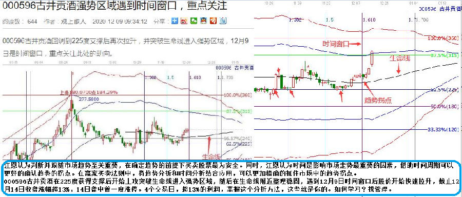 000596古井貢酒在225度獲得支撐后開始上攻突破生命線進入強勢區(qū)域,隨后在生命線附近整理穩(wěn)固,遇到12月9日時間窗口后股價開始快速拉升,截止12月14日收盤漲幅超13%,14日盤中曾一度漲停。4個交易日,超13%的利潤,掌握這個分析方法,這些就是你的。