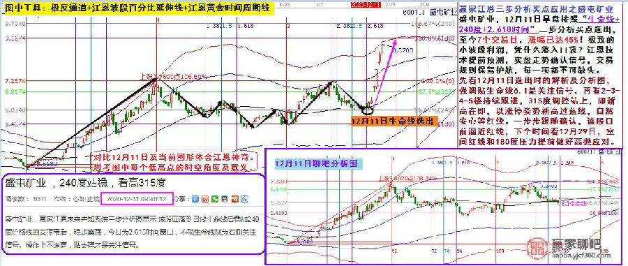 先看12月11日選出時(shí)的解析及分析圖,強(qiáng)調(diào)貼生命線6.1是關(guān)注信號(hào),再看2-3-4-5樓持續(xù)跟進(jìn),315度調(diào)控站上,即新高在即,以漲停姿勢(shì)新高過(guò)藍(lán)線,自然安心等紅線。一步步跟隨確認(rèn),該股目前逼近紅線,下個(gè)時(shí)間看12月29日,空間紅線和180度壓力提前做好高拋應(yīng)對(duì)。