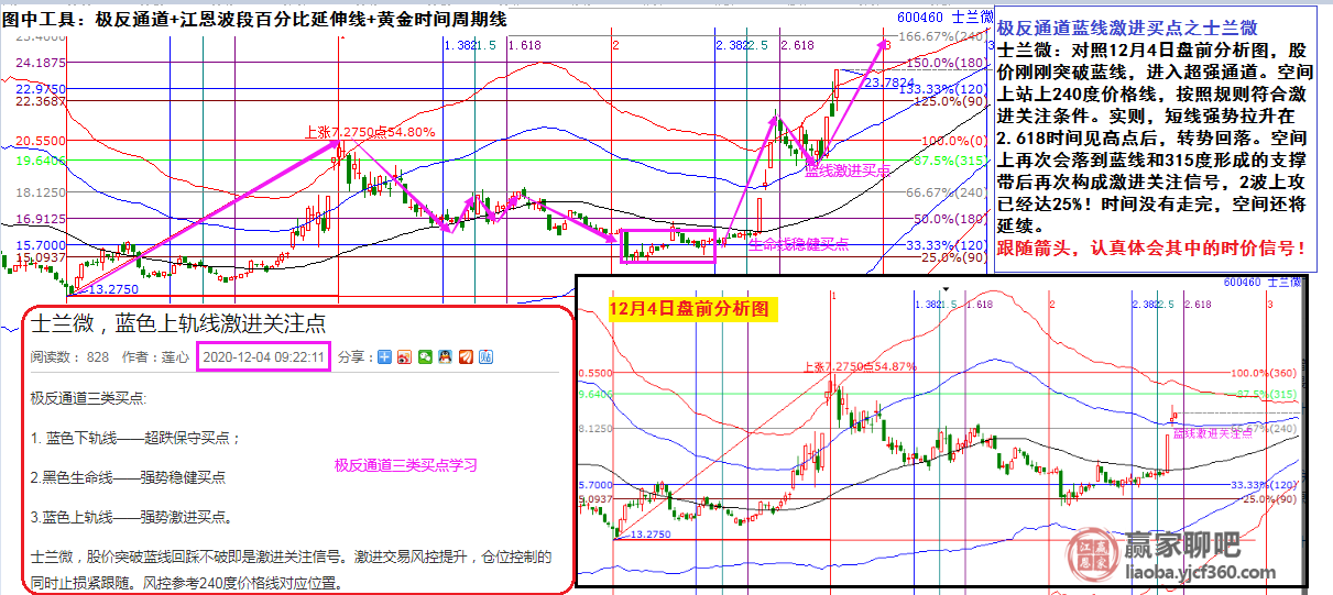 士蘭微:對(duì)照12月4日盤前分析圖,股價(jià)剛剛突破藍(lán)線,進(jìn)入超強(qiáng)通道。空間上站上240度價(jià)格線,按照規(guī)則符合激進(jìn)關(guān)注條件。實(shí)則,短線強(qiáng)勢(shì)拉升在2.618時(shí)間見(jiàn)高點(diǎn)后,轉(zhuǎn)勢(shì)回落??臻g上再次會(huì)落到藍(lán)線和315度形成的支撐帶后再次構(gòu)成激進(jìn)關(guān)注信號(hào),2波上攻已經(jīng)達(dá)25%!時(shí)間沒(méi)有走完,空間還將延續(xù)。(跟隨箭頭,認(rèn)真體會(huì)其中的時(shí)價(jià)信號(hào)?。?/p>