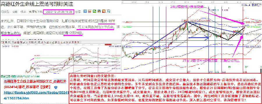 江恩說(shuō),時(shí)間是決定市場(chǎng)走勢(shì)的最重要因素,只有當(dāng)時(shí)間到達(dá),成交量才會(huì)放大,股價(jià)才會(huì)選擇方向-啟動(dòng)拉升或者見(jiàn)頂回落。時(shí)價(jià)融合分析也是江恩理論中的特色分析,多年來(lái)受到眾多投資者的追捧。贏家技術(shù)部近期跟蹤的軍工板塊中,選出高德紅外這個(gè)股票,按照工具做了系統(tǒng)分析并在聊吧做了分享,提示關(guān)注回撤生命線的操作機(jī)會(huì)。股價(jià)在21日周期時(shí)間2倍窗口回撤到生命線和240度支撐附近,出現(xiàn)時(shí)價(jià)共振信號(hào),成交量放大,股價(jià)止跌上行。24日螺旋時(shí)間窗口,成交量繼續(xù)放大,股價(jià)開啟加速拉升突破藍(lán)色線。當(dāng)前價(jià)格站上315度支撐41.49,此位置不破,該股可繼續(xù)看新高。圖中,兩組時(shí)間工具分析圖做了詳細(xì)的標(biāo)記??梢泽w會(huì)下時(shí)間的魅力,如果你懂時(shí)間分析,也能更好的把握市場(chǎng)的波動(dòng)節(jié)奏。