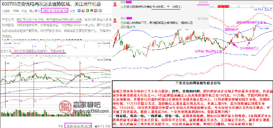 贏家江恩體系分析的三個主要方面是:趨勢,價格和時間。而時間是決定市場走勢的最重要因素,也是贏家分析體系的最大特色之一。9月底即提前確定三安光電的操作機會在10月底,11月初。掌握時間分析,先市場而動。其股價10月底時間窗口在周線生命線共振止跌向上,11月初股價突破日線生命線,短期趨勢轉(zhuǎn)強,11月13日提示關(guān)注,股價隨后上漲至藍色線見高點,本波上漲20%;藍色線跌破后回落生命線,12月24日,30日皆有跟蹤分析提示生命線再次構(gòu)成穩(wěn)健買點,今天股價再次到達藍色線關(guān)鍵點,并突破了歷史新高,股價上漲接近25%。三安光電兩波利潤45%,你能看明白嗎?