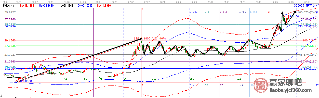 再來看看我們持續(xù)跟蹤2年之久的東方財富,你想要的轉(zhuǎn)勢信號。不管是中期波段還是短期波動,贏家江恩未來先知時價圖全部打盡。每一個箭頭,都是一段波段,都是一組低吸高拋,都是標(biāo)準(zhǔn)的買賣信號,市場到底有多美,你不懂江恩的視角,永遠(yuǎn)也看不到。很多人會問,江恩技術(shù)準(zhǔn)不準(zhǔn)?看看東財?shù)膱D,已經(jīng)走出來的高低點(diǎn),有多少落到了江恩線上,那就有多準(zhǔn)。不是準(zhǔn)不準(zhǔn),而是當(dāng)你一旦捕捉到了個股的規(guī)律,準(zhǔn)的你不敢相信。這就是股市,這就是江恩時價技術(shù)的魅力,好圖只遇有心有緣之人,想深入學(xué)習(xí),聯(lián)系我吧!