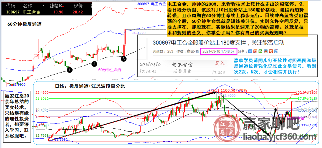 電工合金,帥帥的20CM,來看看技術上憑什么走出這根漲停。先看日線分析圖,該股3月10日股價站上180度價格線,波段內趨勢轉強,且小周期在60分鐘生命線上穩(wěn)步運行。日線沖高藍線受阻震蕩的個股,60分鐘生命線就是短線關注位,實則允許空間反復,只要支撐在,那股就在,實際結果是迎來了20CM的高度。這就是技術和規(guī)則的意義,你學會了嗎?你有自己的買賣規(guī)則嗎?