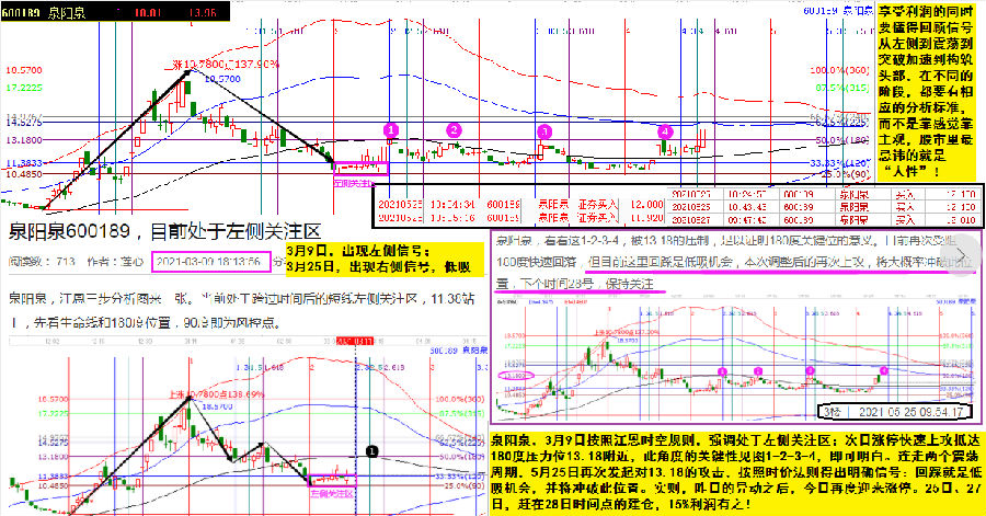 泉陽泉,3月9日按照江恩時空規(guī)則,強調處于左側關注區(qū);次日漲??焖偕瞎サ诌_180度壓力位13.18附近,此角度的關鍵性見圖1-2-3-4,即可明白。連走兩個震蕩周期,5月25日再次發(fā)起對13.18的攻擊,按照時價法則得出明確信號:回踩就是低吸機會,并將沖破此位置。實則,6月2日的異動之后,3日再度迎來漲停。25日、27日,趕在28日時間點的建倉,15%利潤有之!