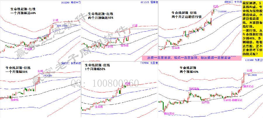 極反通道,是贏家江恩經(jīng)典趨勢(shì)買(mǎi)賣分析工具。其中生命線為強(qiáng)勢(shì)股票啟動(dòng)點(diǎn),買(mǎi)在生命線,小波段看高藍(lán)線,大波段看高紅線。一直在重演,一直被驗(yàn)證。對(duì)照?qǐng)D中個(gè)股,均為生命線處選出關(guān)注,再看這一波行情,從生命線到紅線少則40%,多則翻倍。思考下這種模式。