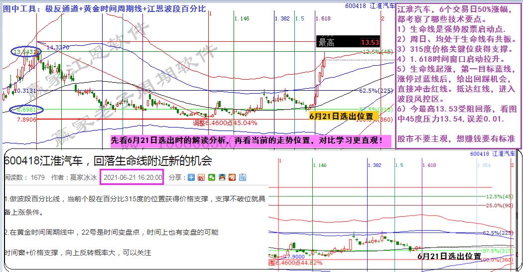 先看6月21日選出時(shí)的解讀分析,再看當(dāng)前的走勢(shì)位置,對(duì)比學(xué)習(xí)更直觀!要擅于總結(jié)牛股快速走強(qiáng)的技術(shù)條件,建立相應(yīng)的交易標(biāo)準(zhǔn),定能克服主觀,依市場(chǎng)信號(hào)有效獲利。