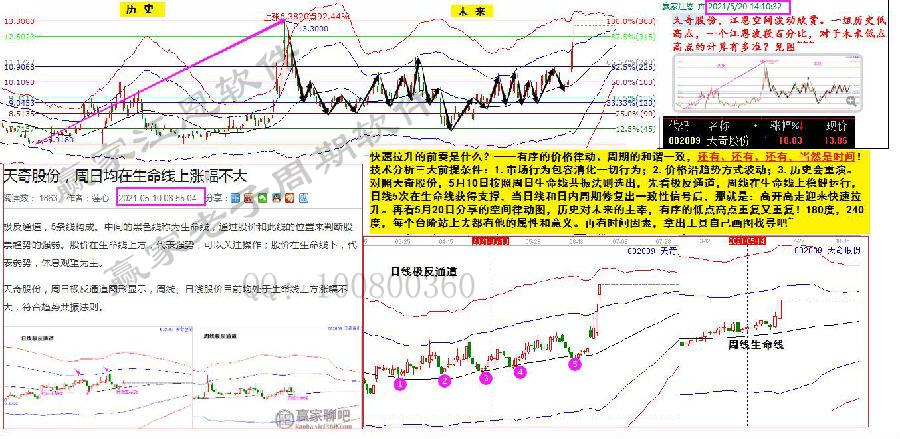 對(duì)照天奇股份,5月10日按照周日生命線共振法則選出,先看極反通道,周線在生命線上穩(wěn)健運(yùn)行,日線5次在生命線獲得支撐,當(dāng)日線和日內(nèi)周期修復(fù)出一致性信號(hào)后,那就是:高開(kāi)高走迎來(lái)快速拉升。再看5月20日分享的空間律動(dòng)圖,歷史對(duì)未來(lái)的主宰,有序的低點(diǎn)高點(diǎn)重復(fù)又重復(fù)!180度,240度,每個(gè)臺(tái)階站上去都有他的屬性和意義。再有時(shí)間因素,拿出工具自己畫圖找尋吧!