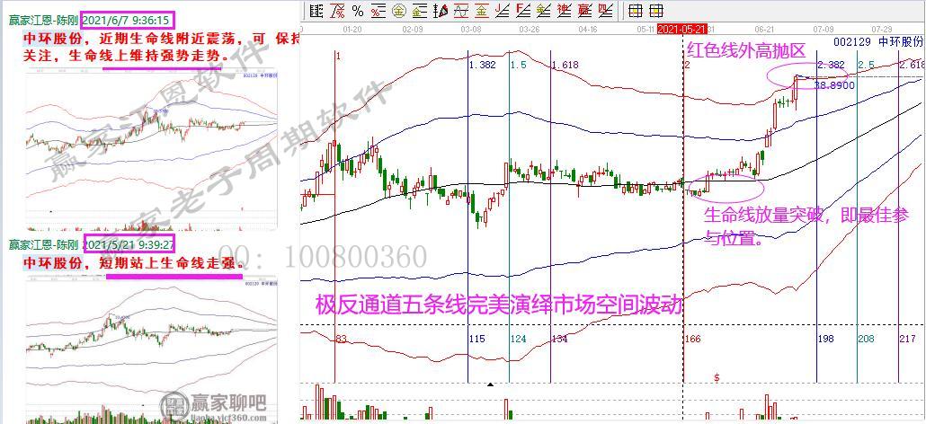 5月21日時(shí)間窗口開(kāi)始關(guān)注中環(huán)股份,當(dāng)日,生命線跌破后,5月31日再次放量突破,回踩不破,構(gòu)成最佳生命線技術(shù)買點(diǎn)。隨后開(kāi)啟拉升階段。今天再次放量大漲,股價(jià)突破紅色線,生命線啟動(dòng)后累計(jì)上漲超過(guò)40%;紅色線外高風(fēng)險(xiǎn)區(qū),保持謹(jǐn)慎。從買到賣,從生命線到紅色線,交易信號(hào)明確。極反通道完美把握市場(chǎng)的空間波動(dòng)。按照買賣信號(hào)交易,做理性投資。