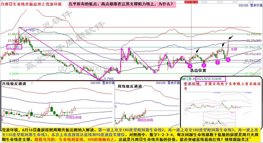 雪浪環(huán)境,6月16日盤前按照周期共振法則納入解讀。第一波上攻至180度受阻回落生命線2;再一波上攻至180度受阻回落生命線3;再一波上攻至135度受阻回落生命線3;本次上攻直接抵達(dá)藍(lán)線和90度波段關(guān)健位。對(duì)照?qǐng)D中:數(shù)字1-2-3-4,每次回踩生命線都敢于低吸的前提是周月大周期生命線在支撐。穩(wěn)穩(wěn)當(dāng)當(dāng)?shù)模荷€到藍(lán)線,30%的漲幅有之。這就是月周日生命線共振的價(jià)值。能否突破藍(lán)線看高紅線?繼續(xù)跟蹤關(guān)注~