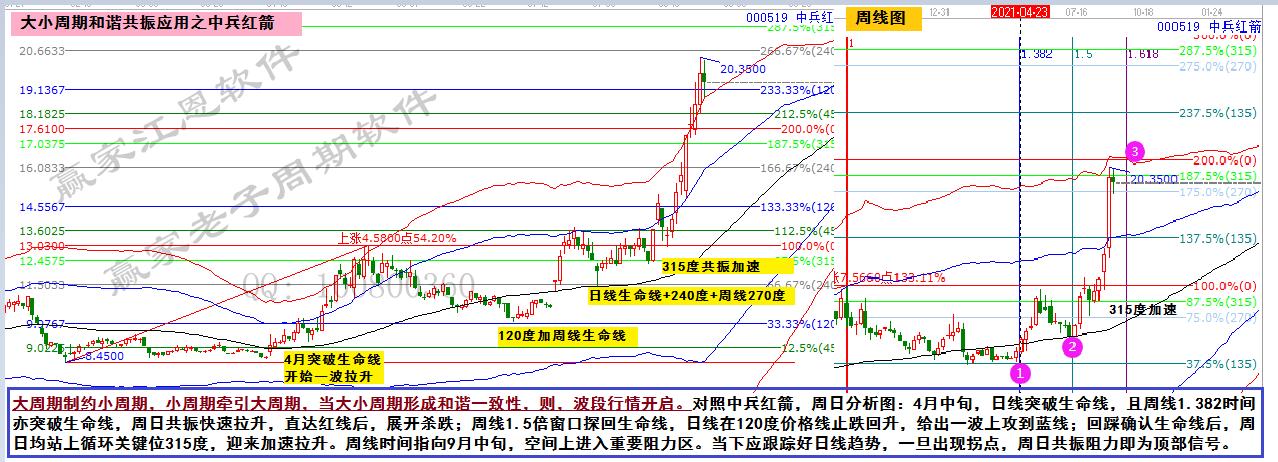 大周期制約小周期,小周期牽引大周期,當大小周期形成和諧一致性,則,波段行情開啟。對照中兵紅箭,周日分析圖:4月中旬,日線突破生命線,且周線1.382時間亦突破生命線,周日共振快速拉升,直達紅線后,展開殺跌;周線1.5倍窗口探回生命線,日線在120度價格線止跌回升,給出一波上攻到藍線;回踩確認生命線后,周日均站上循環(huán)關鍵位315度,迎來加速拉升。周線時間指向9月中旬,空間上進入重要阻力區(qū)。當下應跟蹤好日線趨勢,一旦出現(xiàn)拐點,周日共振阻力即為頂部信號。