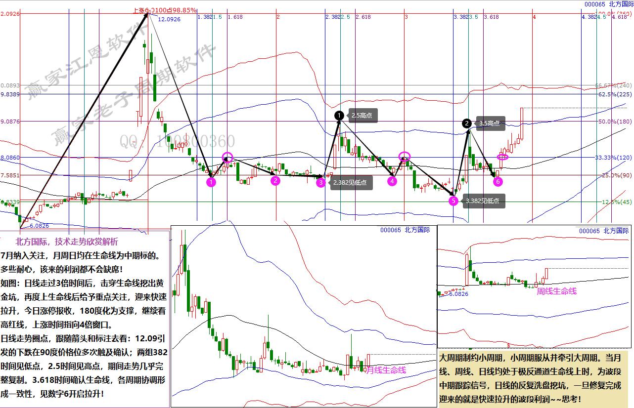 如圖:日線走過3倍時間后,擊穿生命線挖出黃金坑,再度上生命線后給予重點(diǎn)關(guān)注,迎來快速拉升,今日漲停報收,180度化為支撐,繼續(xù)看高紅線,上漲時間指向4倍窗口。