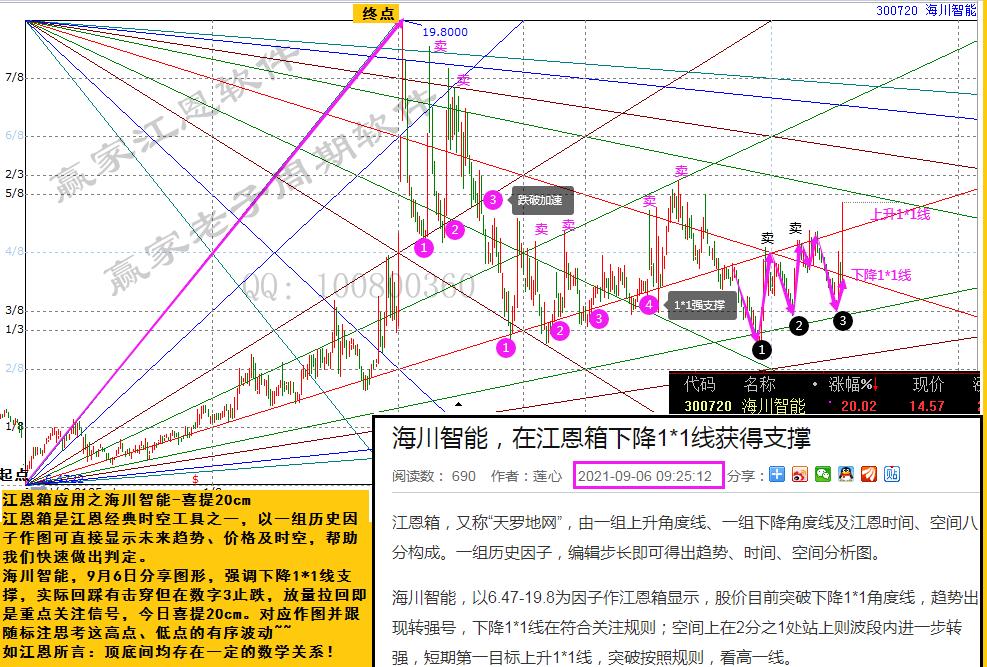 海川智能,9月6日分享圖形,強(qiáng)調(diào)下降1*1線支撐,實際回踩有擊穿但在數(shù)字3止跌,放量拉回即是重點關(guān)注信號,今日喜提20cm。對應(yīng)作圖并跟隨標(biāo)注思考這高點、低點的有序波動~~